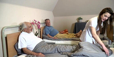 - Brunette nurse blows an old dude as his friends looks on