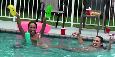 - Blonde has fun with friend by pool while her roommates watch